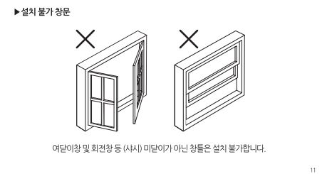 - 창문이 열렸을 때 가로 38cm 초과의 공간, 창문 높이 92cm 이상의 미닫이 창에 설치가 가능합니다.