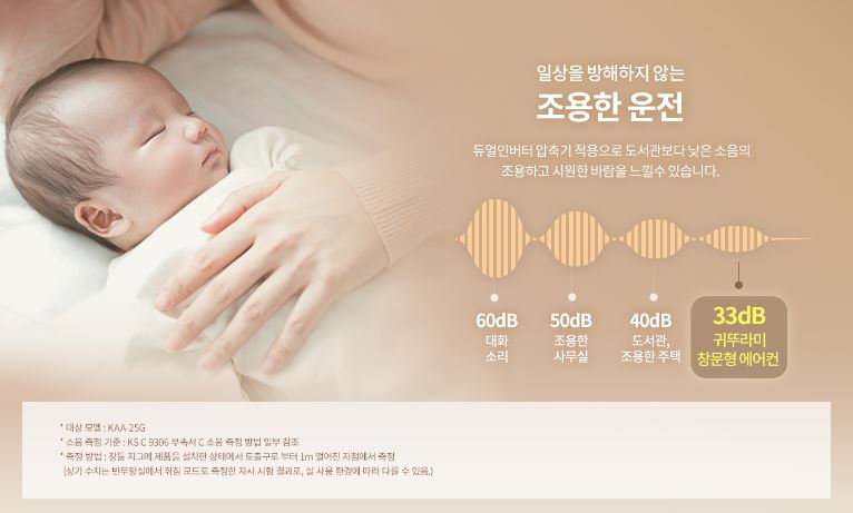 : 창문형 에어컨의 최대 단점이라고 할 수 있는 소음이 귀뚜라미 창문형 에어컨에도 있지만, 귀뚜라미 창문형 에어컨은 도서관보다 낮은 최저 33 데시벨 소음의 저소음 구현으로, 소음이 거의 없다고 할 수 있습니다.