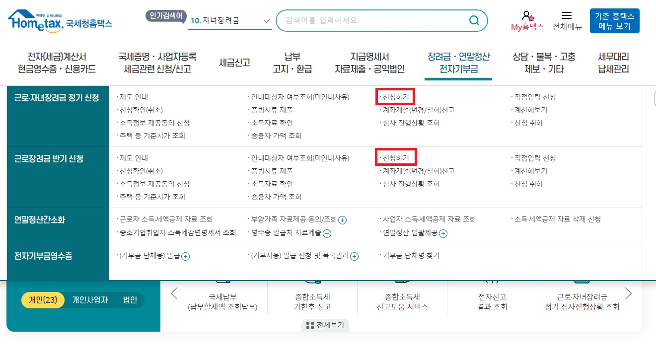 2) 홈택스 화면에서 장려금,연말정산,전자기부금 - 근로,자녀장려금 정기/반기 신청 - 신청하기 선택합니다.