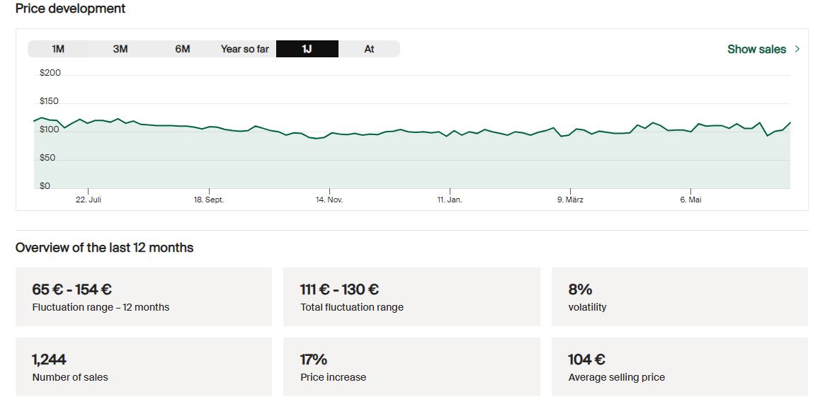 12달 동안 최저가는 65유로, 최고가는 154유로 평균가는 104유로로 한화로 환산했을 때, 15만 5천 원 정도입니다.
