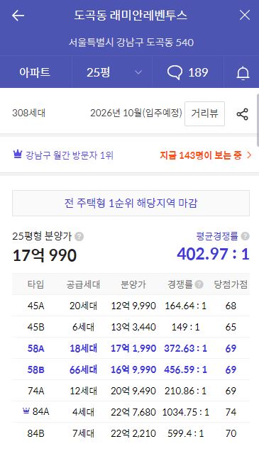 래미안 원페를라는 총 1,097세대의 대단지이며 이 중 일반분양 물량이 총 465세대나 공급됩니다. 게다가 일반분양 물량 중에서 국민평형이라고 할 수 있는 84㎡(약 34평) 평형이 324세대 분양 예정에 있어, 최근 원펜타스, 레벤투스 등의 강남권 아파트 청약에 도전하지 못하신 분, 혹은 실패하신 분도 충분히 도전해 볼 만한 단지입니다.