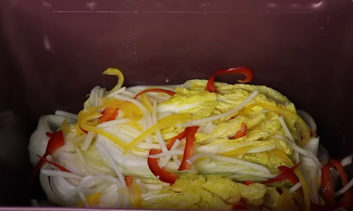 이제 절인 배추에 준비한 재료들을 넣어 버무릴 차례입니다. 배추 사이사이에 무채와 파프리카, 파, 청각을 넣어주세요. 그 다음 만들어둔 국물 양념을 골고루 부어줍니다. 이때 국물이 배추를 완전히 덮을 정도로 넉넉히 부어주는 것이 중요해요.