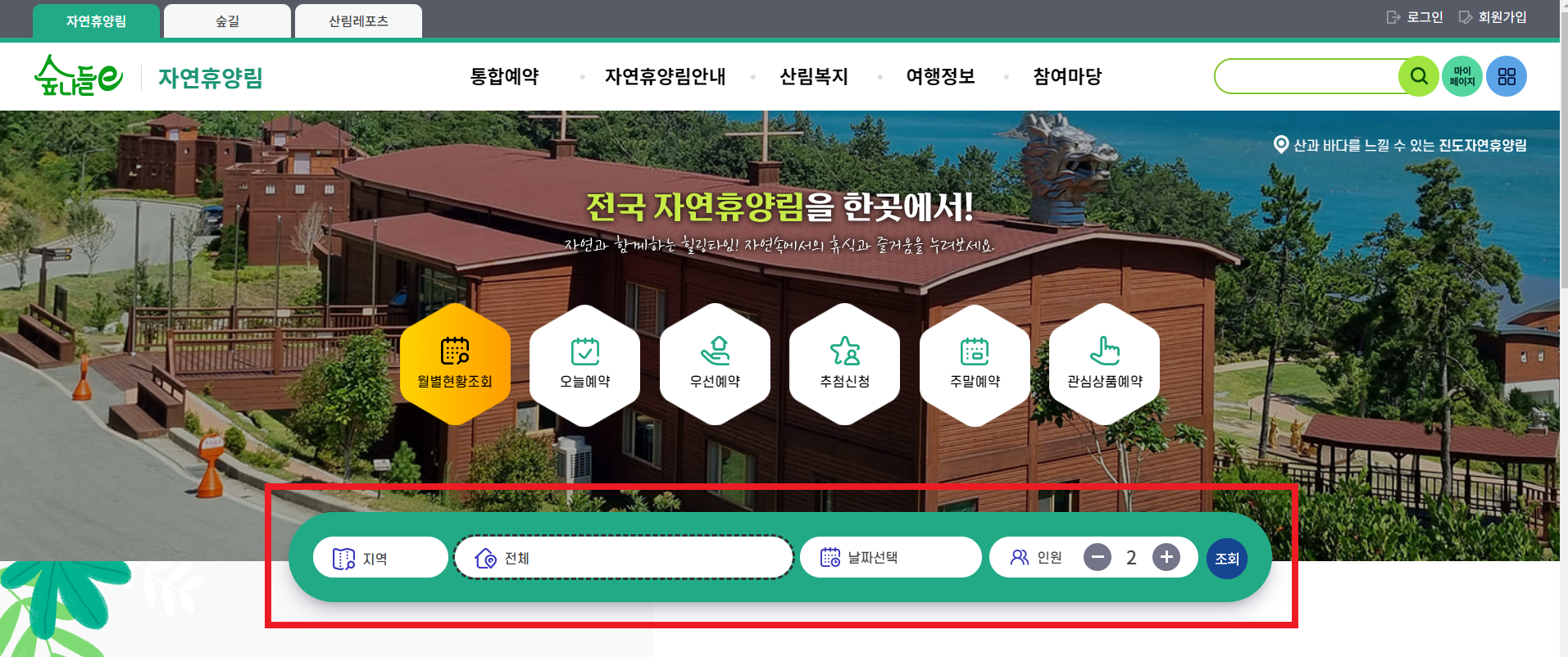 - 숲나들e 홈페이지 로그인하고 메인 페이지의 원하는 지역 > 자연휴양림 명칭/날짜/ 인원을 입력하고 '조회'를 클릭합니다
