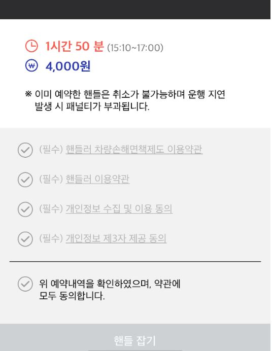 1. 핸들 리스트 중 '배차'와 '반차' 중 배차는 해당 시간에 정확히 배차가 되기 때문에 해당 시간에 맞춰 새로 고침을 하며 대기하는 것이 핸들 잡기가 수월하고, '반차'의 경우 고객 사용 완료 후 반납하는 시간이 일정하지가 않기에 배차 알람을 적절하게 활용합니다.