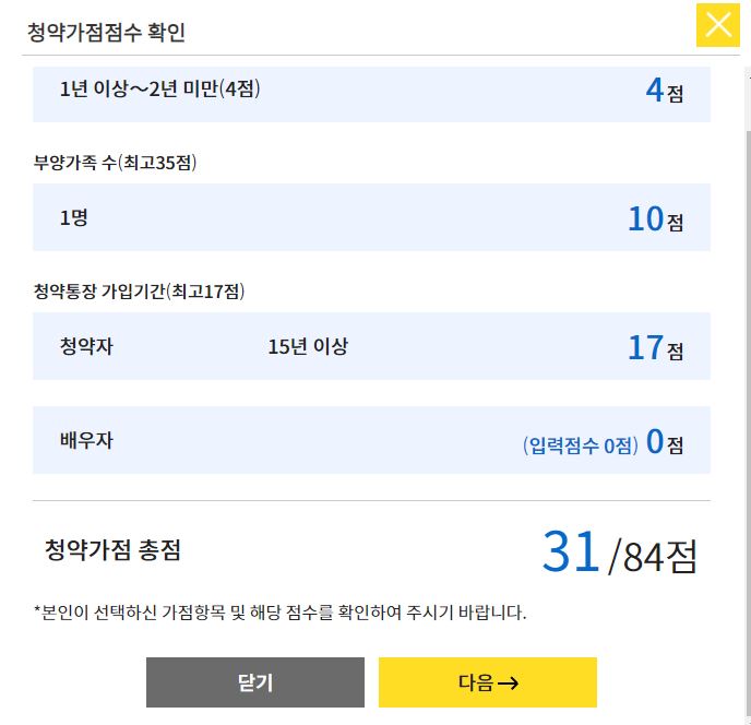 8. 가점항목 확인 후 내용을 입력해 줍니다. 무주택기간, 부양가족수, 청약통장 가입일 등이 기입되어야 하는데 마이데이터 정보 제공을 수락하셨으면, 자동으로 입력됩니다. 간혹 가점을 받기 위해서 허위 작성을 하시는 경우가 있는데 모두 부적격으로 탈락할 수 있기 때문에 정확하고, 사실대로 입력해주셔야 합니다. 입력하신 뒤에 '예'를 체크하신 뒤 다음을 클릭하시면, 청약 가점점수를 확인할 수 있습니다. 청약가점점수 확인하신 뒤 다음을 눌러주세요.
