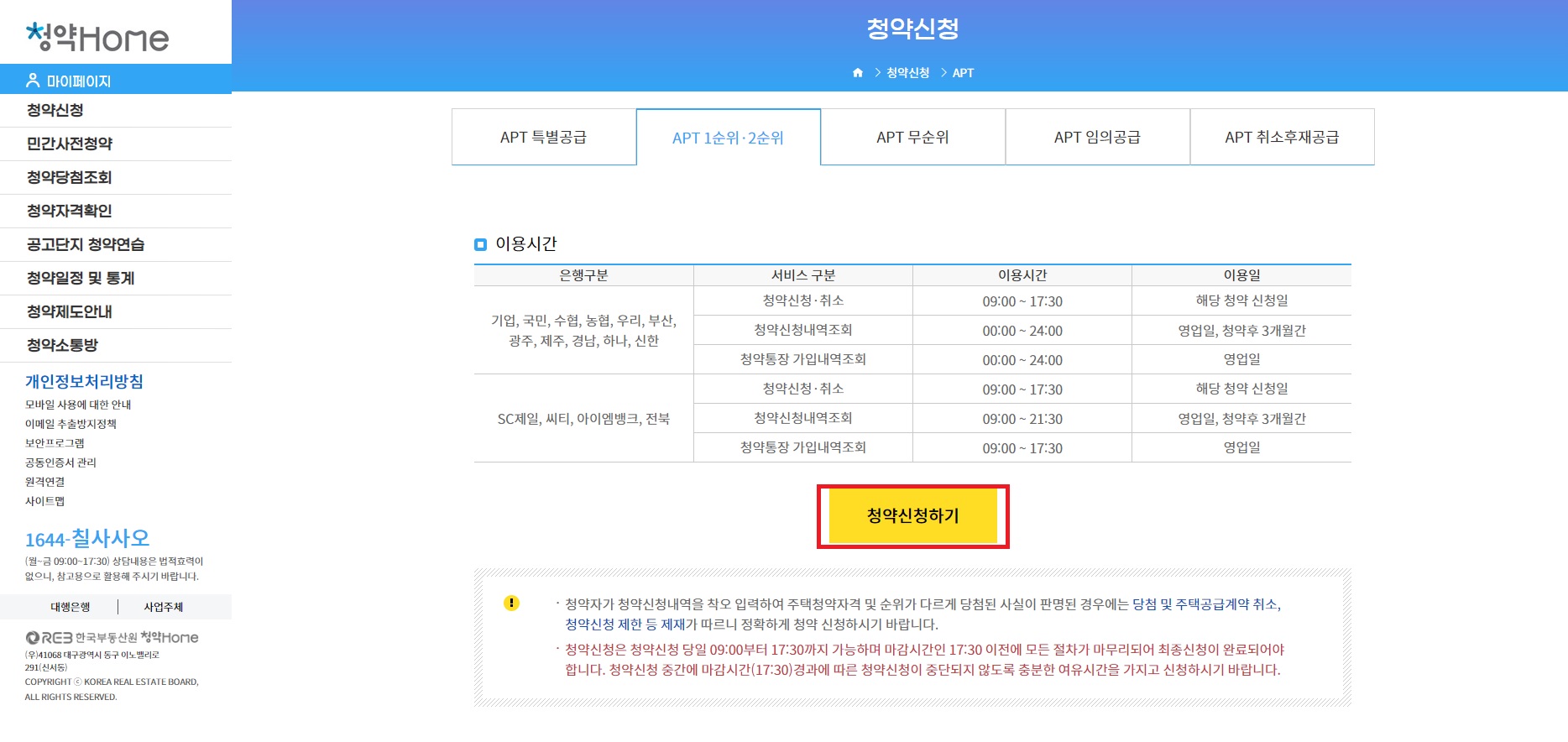 2. 본인이 해당하는 유형을 클릭한 뒤(일반적인 경우 APT 1순위, 2순위) '청약신청하기' 클릭
