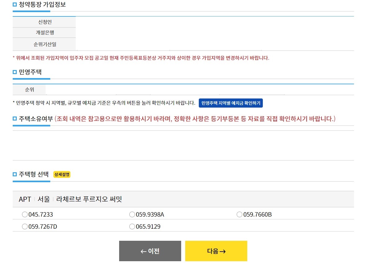 5. 청약통장 가입정보, 민영주택 순위, 주택소유 여부 등을 확인해 주시고, 청약 신청을 원하시는 주택형을 선택 후에 다음을 클릭해 주세요.